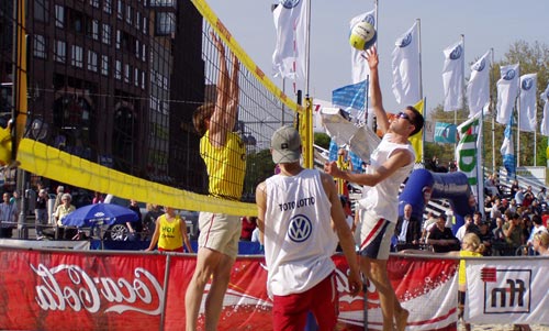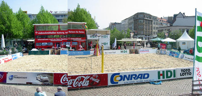 Endlich war es soweit. Chris und ich trafen uns am Freitag morgen um mit dem Zug nach Hannover zu fahren, wo wir unser 1.Turnier des Sommers 2004 spielen sollten. Offiziell ging es zur Top-10-Qualifikation eines NVV-Landesverbandsturniers, inoffiziell war es allerdings eher einer Quali für einen Renault-Beach-Cup gleichzusetzen. Es war schon ziemlich heftig. Da waren nun 12 Teams in der Quali und davon waren nur noch 4 von der eigentlichen NVV-Tour. Der Rest kam aus ganz Deutschland um sich die DVV-Punkte abzuholen, die es in Hannover ja auch gab! Und da das Hauptfeld dermaßen unverschämt gut besetzt war, mußten all diese DVV-Teams in die Quali ...