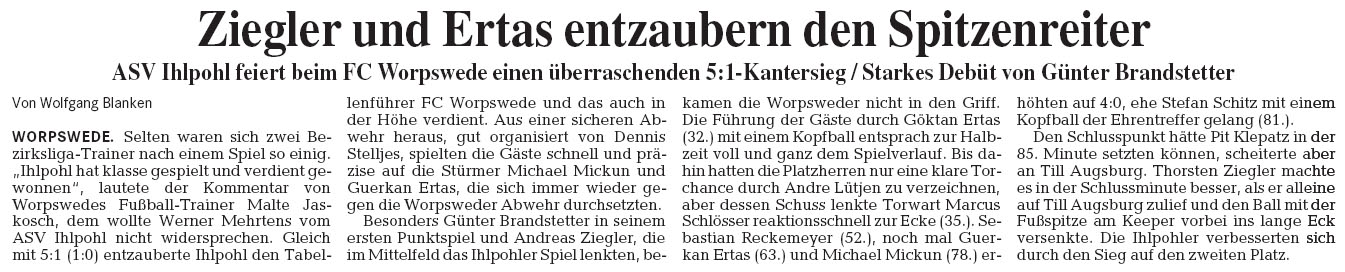 14 Spiele - 53 Tore. Das macht... mooooment ... (2 im sinn)... äääähm... irgendwas mit 3,7 Treffer pro Spiel. Und die Null stand auch mal wieder. 5:0 gegen den TSV Uesen - das hört sich doch sehr zufriedenstellend an. War es auch, besonders wenn man mal unsere Kaltschnäuzigkeit vor dem gegnerischen Kasten betrachtet und unserer Stärke bei Standards. Das war schon ziemlich beeindruckend. Aber gerade in der zweiten Halbzeit fehlte gegen einen aggressiven und mutig zu Werke gehenden Gegner etwas 30 Minuten total die Ordnung. Da sind wir zu sorglos aufgetreten und daran müssen wir arbeiten. Aber alles in allem sind wir natürlich mit diesem 5:0 gegen starke Uesener vollauf zufrieden. |