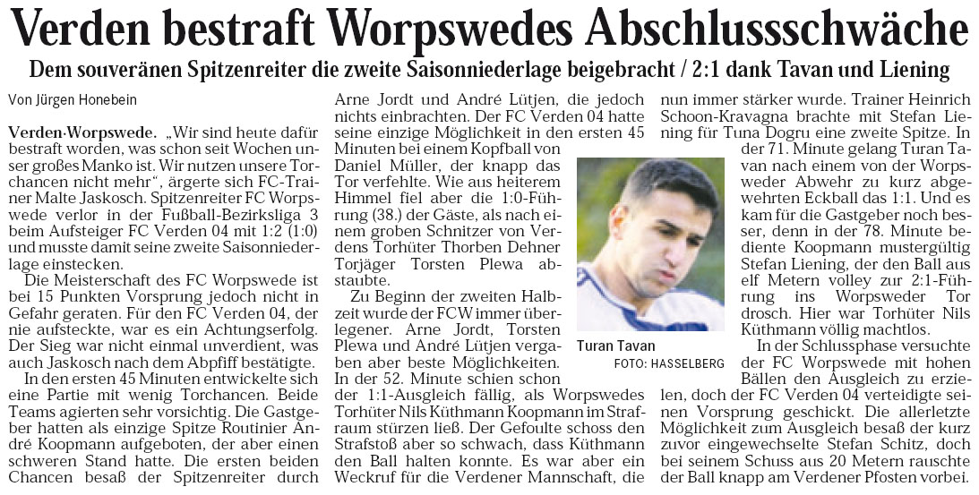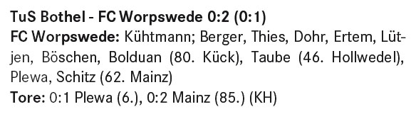 Vielleicht waren wir noch ein wenig vom Presse-Cup-Sieg gegen den Bremer SV berauscht. Vielleicht war es aber auch einfach nur so ein Spiel, wie es immer mal vorkommt in einer langen Saison und bei denen es irgendwie lediglich auch nur darum geht, das man sie gewinnt. Das das 2:0 (1:0) beim TuS Bothel und vor allem die spielerische und läuferische Leistung nicht unseren Ansprüchen genügt, ist jawohl ganz klar. Dennoch kann man auch nicht jedes Mal ein Schützenfest erwarten. Fakt ist: Auch diese drei Punkte sind im Sack und wir bleiben in der Spur. Und außerdem: Als wir das letzte Mal einen tollen Pokalerfolg unter der Woche gefeiert haben, setzte es danach eine gewisse 1:5-Pleite ... |