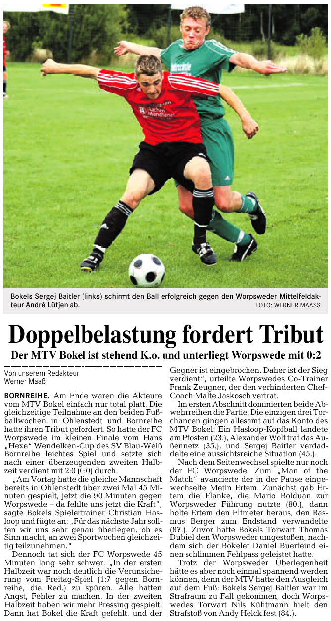 Das war eine gute Antwort auf die verheerende 1:7-Schlappe gegen Bornreihe. Im Spiel um Platz drei besiegen wir den Bezirksligisten MTV Bokel hochverdient mit 2:0. Dabei bestimmen wir fast über die komplette Spielzeit das Geschehen auf dem Platz und müssten eigentlich schon viel früher den Sack zu machen. Am Ende haben wir dann zwar noch ein bisschen Glück, als es einen "seltsamen" Elfmeter gibt, den Nils Kühtmann aber bravourös pariert. Alles in allem geht der Sieg jedoch mehr als in Ordnung. Mit dem dritten Platz haben wir das beste Ergebnis einer Worpsweder Mannschaft bei der Bornreiher Sportwoche erreicht ... Presse / Telegramm |