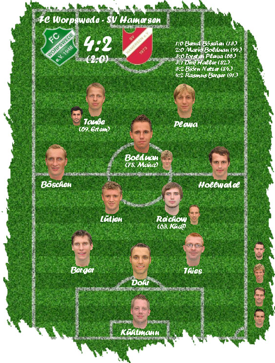 Wie bereits im Hinspiel (2:1) tun wir uns auch im Rückspiel gegen den SV Hamersen mächtig schwer. Zwar geht der 4:2-Erolg letztlich mehr als in Ordnung, doch vom spielerischen Glanz vergangener Spieler sind wir diesmal weit entfernt. Das lag zum einen an einem forsch auftretenden Gegner, aber natürlich auch an Tobels Roter Karte (57.). Am Ende kommt Hamersen noch einmal auf 2:3 heran, Rasmus extremst souverän verwandelter Elfmeter besiegelt schließlich unseren 15. Sieg im 16. Saisonspiel. Jetzt noch zwei Siege in den beiden ausstehenden Spielen gegen Verden und Lilienthal und eine außergewöhnliche Herbstserie hat ein würdiges Ende gefunden! |