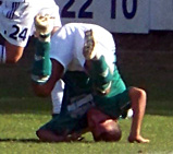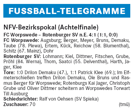 Till Augsburg, Torwartgott! Mehr bleibt nach diesem Bezirks-Pokalabend gegen den Ligarivalen Rotenburger SV eigentlich nicht zu sagen. Im Elfmeterschießen pariert unser Keeper nacheinander die Schüsse von Kai Jager, Christoph Grube und Oliver Dittmer, hielt dabei den ersten Elfmeter sogar fest!!!! Und das alles ganz ohne Spickzettel in den Stutzen! Da ausgerechnet Ole und Drilon vorher sicher verwandelt hatten und auch Rasmus trotz Schwächeanfalls den gegnerischen Torwart durch seinen hypnotisch langsam geschossenen Ball total aus der Fassung gebracht hatte, war das Elfmeterschießen bereits nach drei Schützen entschieden. Siehste wohl, muss doch nicht immer ein 11:10 mit anschließender Rote Karte sein. ;-) |
