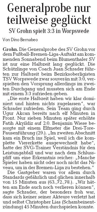 Der erste Pflichtspielauftritt ist geglückt. In der ersten Runde des Bezirkspokals besiegten wir den Bezirksligisten SV Lilienthal/Falkenberg mit 3:1 (1:0). Es war ein glanzlos herausgespielter Sieg, bei dem wir allerdings stets das Geschehen unter Kontrolle hatten. In der nächsten Runde treffen wir nun auf den Klassenrivalen VSK II. Am Dienstagabend traten wir dann noch mal zu einem weiteren Testspiel gegen den Bremen-Ligisten SV Grohn an. Es entwiockelte sich ein kurioses Spiel mit zwei Halnzeiten, wie sie unterschiedlicher kaum hätten sein können. Lagen wir nach katastrophalen Eigenfehlern zur Pasue noch mit 0:3 zurück, so besannen wir uns nach Wiederanpfiff eines Besseren und drehten die Partie noch. Am Ende hieß es 3:3 und wir waren dem Siegtreffer sogar näher, als der Klassenhöhere Gast aus Bremen. |