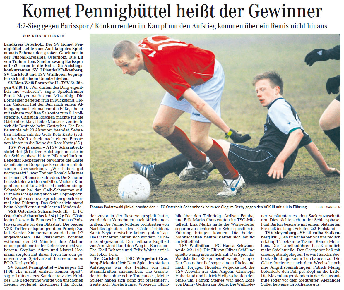 In einem kurzfristig anberaumten (und diesmal auch stattgefundenem) Testspiel trennen wir uns 1:3 (0:1) vom FC Worpswede. Der ligahöhere Gegner geht dabei vollauf zurecht als Gewinner vom Feld, doch auch bei uns waren sehr gute Ansätze zu sehen. Besonders der Spielzug zum zwischenzeitlich 1:1-Ausgleich durch Timo war aller Ehren wert. Und danach hatten wir weitere gute 10 Minuten. Schade, hätte Malte gerne ne Niederlage beigepult... :-)