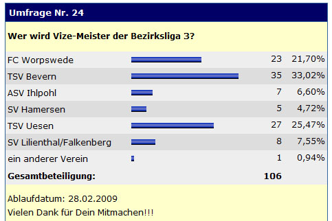 Naja, ich denke mal, da war wohl wieder der Wunsch Vater des Gedanken. Irgendwer, der es uns entweder nicht gönnt, oder einfach nicht dran glauben kann und will, stimmte fleißig für uns ab. So kommt es dass, wir mit fast 22% Platz drei belegen, bei der Frage nach dem Vize-Meister der diesjährigen Saison. Auch der TSV Uesen konnte wohl einige Fans aktivieren. Auf Platz eins landete dennoch der große Favorit: Unser ärgster und wohl auch letzter Verfolger TSV Bevern.